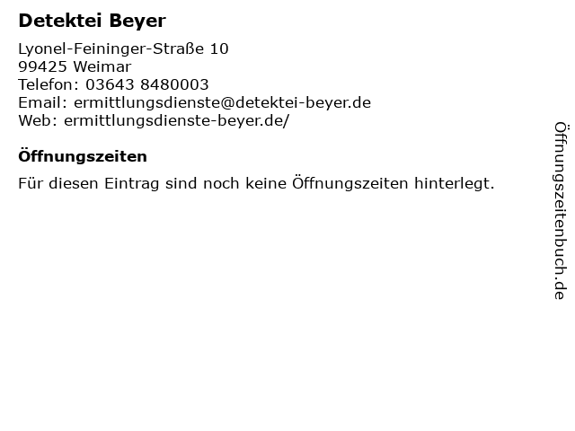 | Öffnungszeiten Detektei Beyer in Weimar anzeigen | |