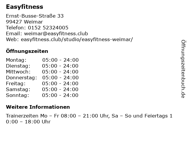 | Öffnungszeiten Easyfitness in Weimar anzeigen | |