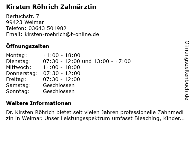 | Öffnungszeiten Kirsten Röhrich Zahnärztin in Weimar anzeigen | |