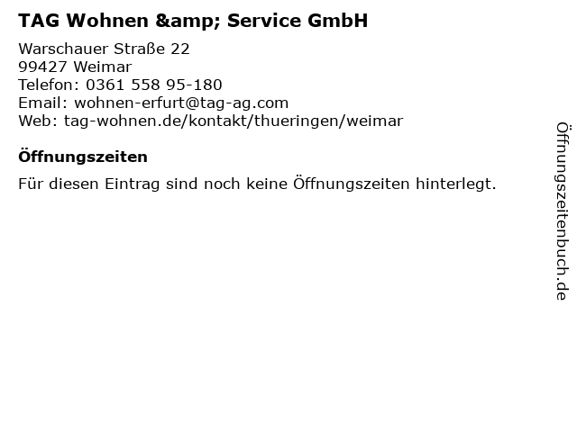 | Öffnungszeiten TAG Wohnen & Service GmbH in Weimar anzeigen | |