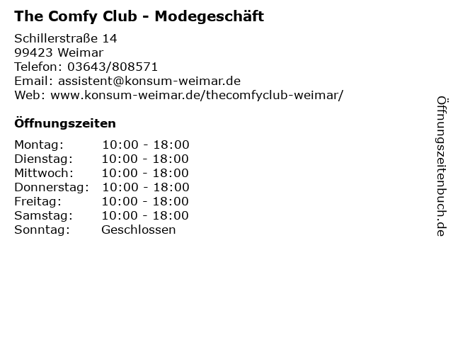 | Öffnungszeiten The Comfy Club - Modegeschäft in Weimar anzeigen | |