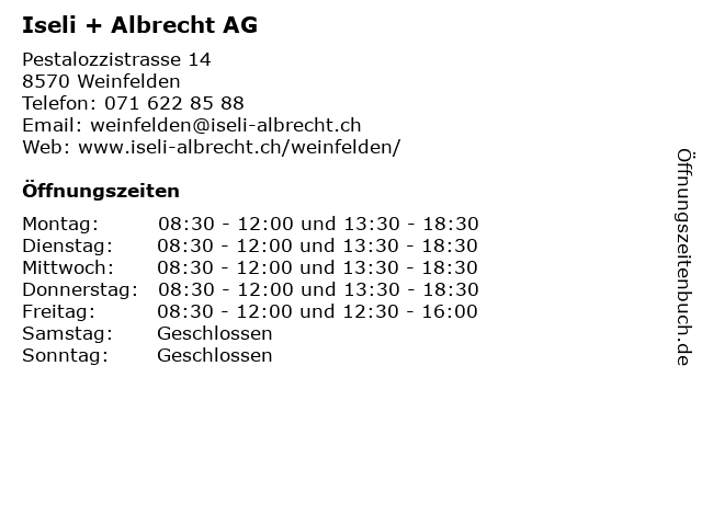| Öffnungszeiten Iseli + Albrecht AG in Weinfelden anzeigen | |