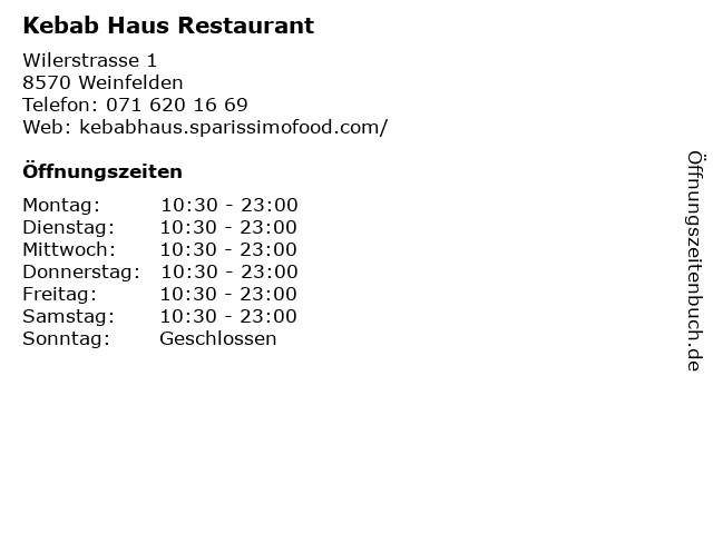 | Öffnungszeiten Kebab Haus Restaurant in Weinfelden anzeigen | |