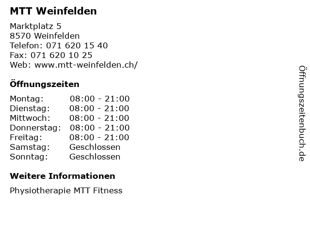 | Öffnungszeiten MTT Weinfelden in Weinfelden anzeigen | |