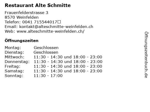 | Öffnungszeiten Restaurant Alte Schmitte in Weinfelden anzeigen | |