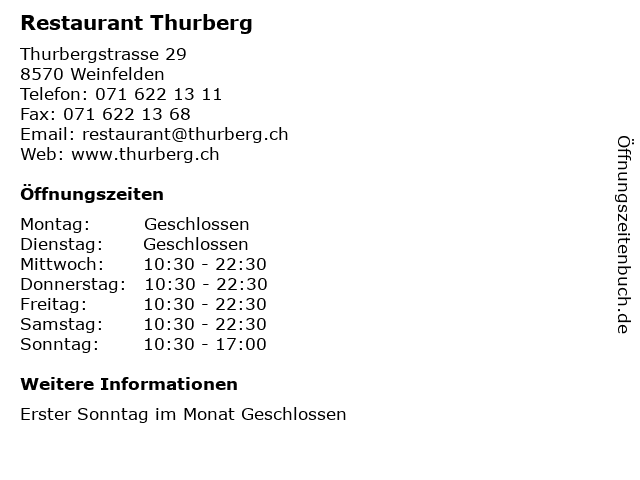 | Öffnungszeiten Restaurant Thurberg in Weinfelden anzeigen | |