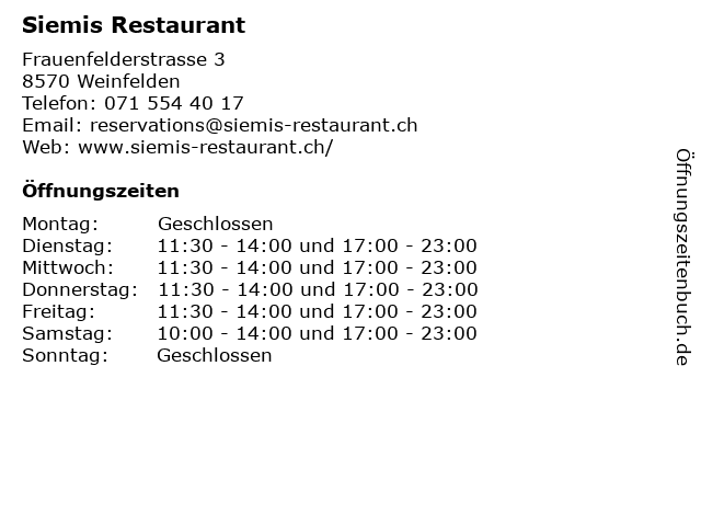| Öffnungszeiten Siemis Restaurant in Weinfelden anzeigen | |