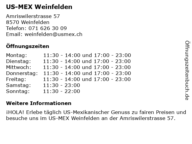 | Öffnungszeiten US-MEX Weinfelden in Weinfelden anzeigen | |