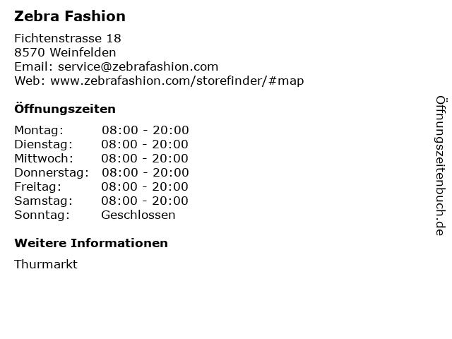 | Öffnungszeiten Zebra Fashion in Weinfelden anzeigen | |