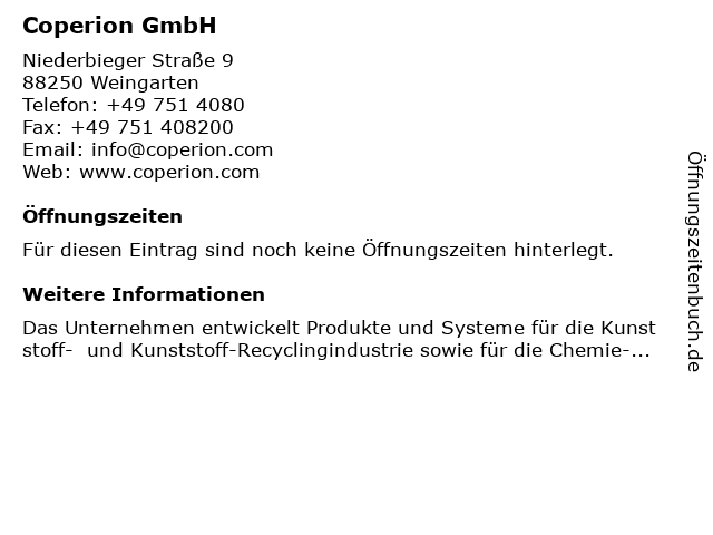 | Öffnungszeiten Coperion GmbH in Weingarten anzeigen | |