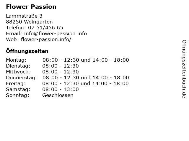 | Öffnungszeiten Flower Passion in Weingarten anzeigen | |