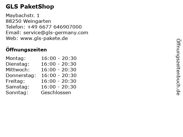 | Öffnungszeiten GLS PaketShop in Weingarten anzeigen | |