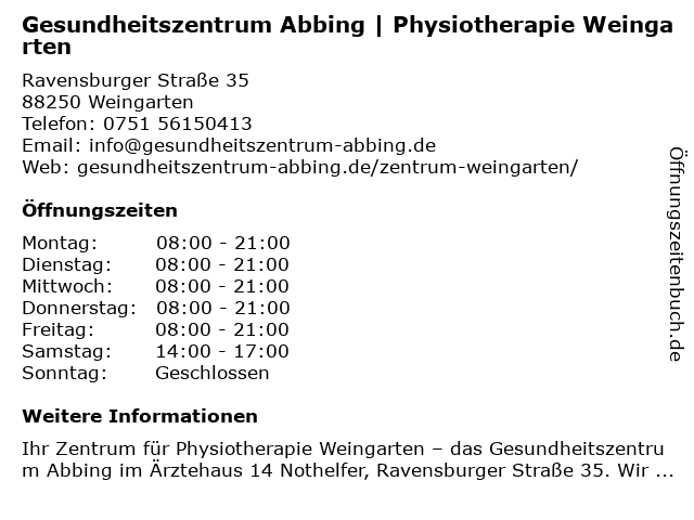 Branchen & Suchbegriffe zu Gesundheitszentrum Abbing | Physiotherapie Weingarten:abbing, gesundheitszentrum, massagetherapie, | physiotherapie |