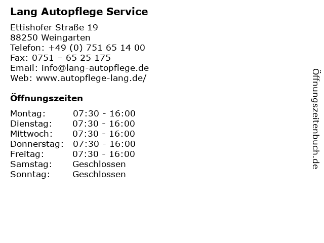 | Öffnungszeiten Lang Autopflege Service in Weingarten anzeigen | |