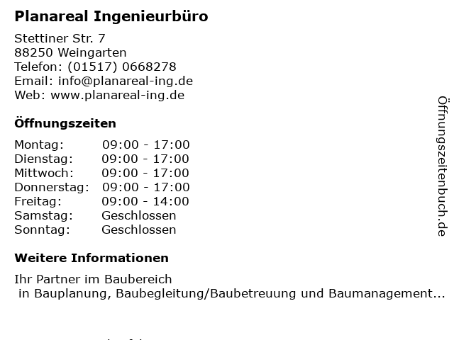 | Öffnungszeiten Planareal Ingenieurbüro in Weingarten anzeigen | |