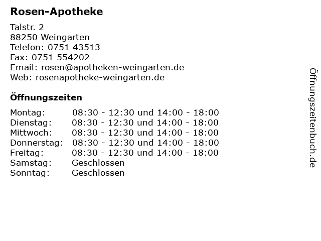 | Öffnungszeiten Rosen-Apotheke in Weingarten anzeigen | |