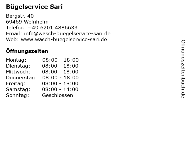| Öffnungszeiten Bügelservice Sari in Weinheim anzeigen | |