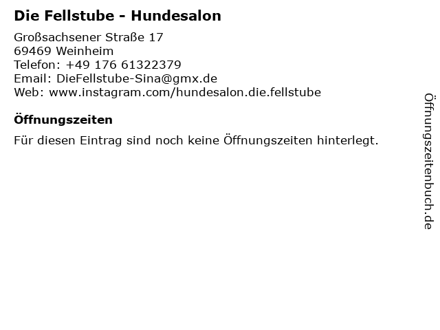 | Öffnungszeiten Die Fellstube - Hundesalon in Weinheim anzeigen | |