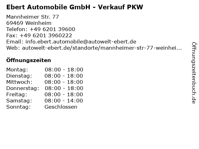 1 Autohaus Ebert-Diehm GmbH & Co. KG Service-Center Weinheim - PKW Annahme (Entfernung: 0,01 km) Mannheimer Straße 77, 69469 Weinheim 5 Autohaus Martin Schmidt Inh.: Nino Tortora e.K. - Pkw-Verkauf (Entfernung: 14,44 km) Bürstädter Str. 37, 68623 Lampertheim 6 |
