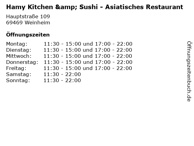 | Öffnungszeiten Hamy Kitchen & Sushi - Asiatisches Restaurant in Weinheim anzeigen | |