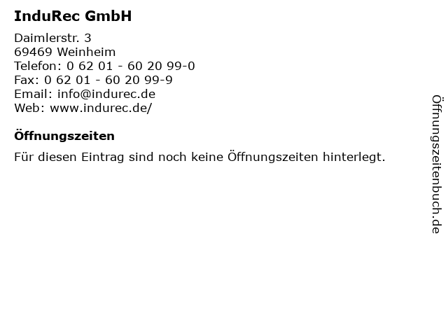 | Öffnungszeiten InduRec GmbH in Weinheim anzeigen | |