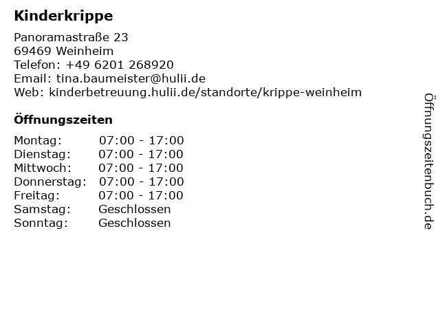 | Öffnungszeiten Kinderkrippe in Weinheim anzeigen | |