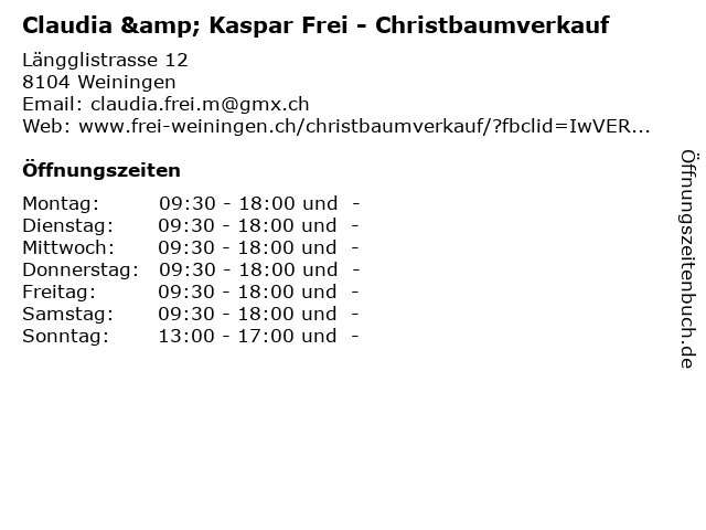| Öffnungszeiten Claudia & Kaspar Frei - Christbaumverkauf in Weiningen anzeigen | |