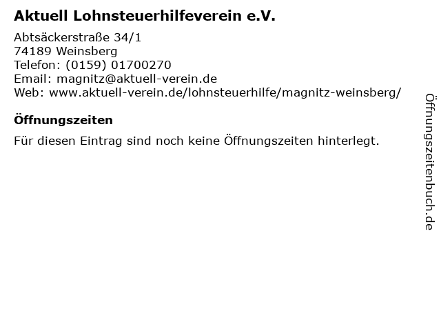 2 Aktuell Lohnsteuerhilfeverein e.V. (Entfernung: 7,37 km) Erlenhau 3, 74199 Untergruppenbach - Unterheinriet 6 Aktuell Lohnsteuerhilfeverein e.V. (Entfernung: 17,72 km) Ziegeleistraße 2, 74193 Schwaigern - Massenbach |