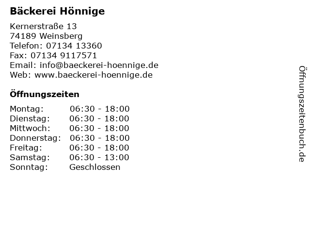 | Öffnungszeiten Bäckerei Hönnige in Weinsberg anzeigen | |