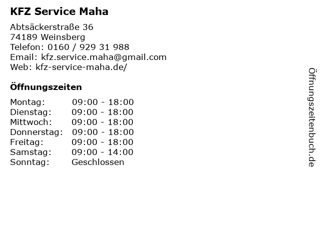 | Öffnungszeiten KFZ Service Maha in Weinsberg anzeigen | |