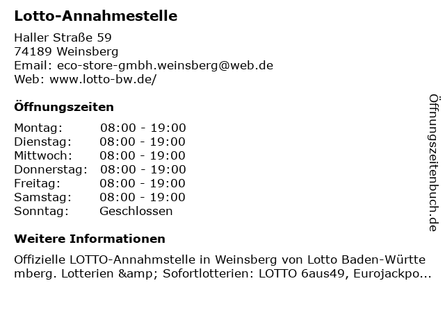 | Öffnungszeiten Lotto-Annahmestelle in Weinsberg anzeigen | |