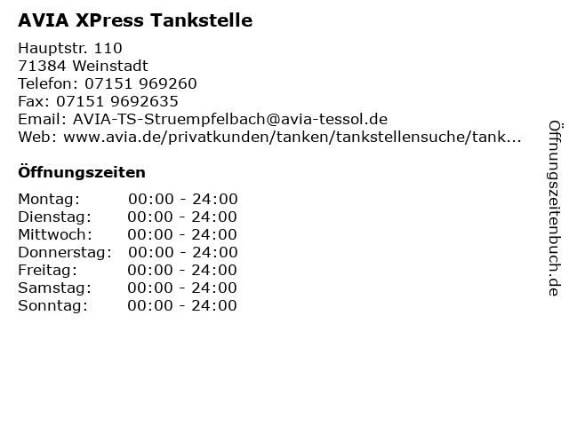 | Öffnungszeiten AVIA XPress Tankstelle in Weinstadt anzeigen | |