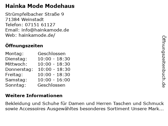 | Öffnungszeiten Hainka Mode Modehaus in Weinstadt anzeigen | |