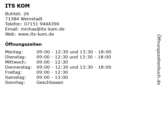| Öffnungszeiten ITS KOM in Weinstadt anzeigen | |
