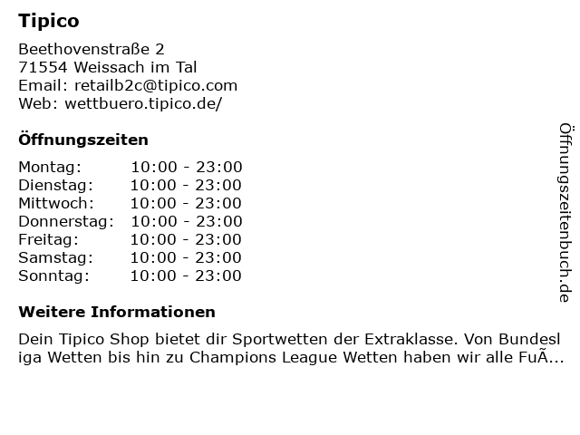| Öffnungszeiten Tipico in Weissach im Tal anzeigen | |