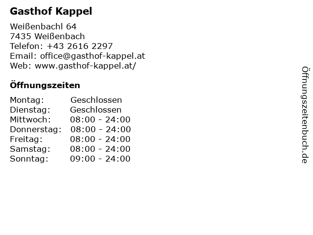| Öffnungszeiten Gasthof Kappel in Weißenbach anzeigen | |