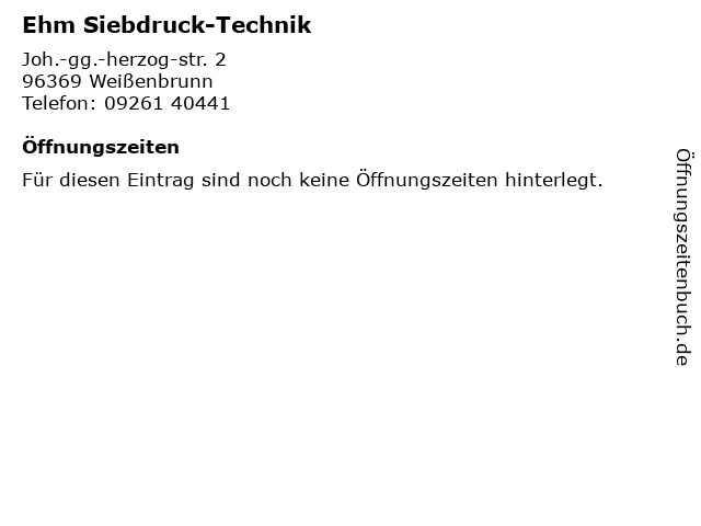 | Öffnungszeiten Ehm Siebdruck-Technik in Weißenbrunn anzeigen | |