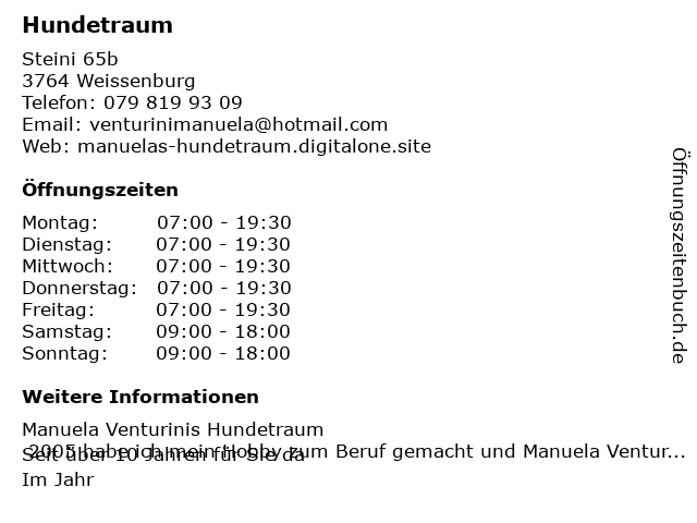 | Öffnungszeiten Hundetraum in Weissenburg anzeigen | |