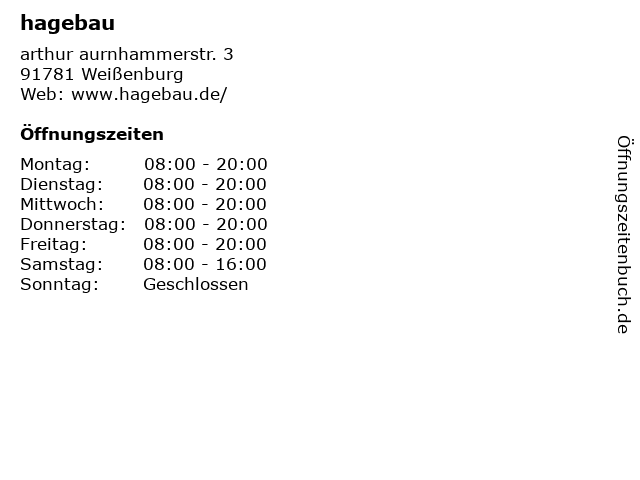 | Öffnungszeiten hagebau in Weißenburg anzeigen | |