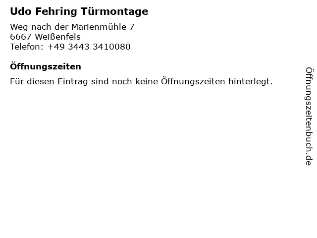 | Öffnungszeiten Udo Fehring Türmontage in Weißenfels anzeigen | |