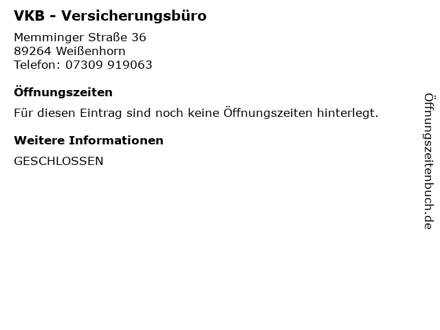 | Öffnungszeiten VKB - Versicherungsbüro in Weißenhorn anzeigen | |