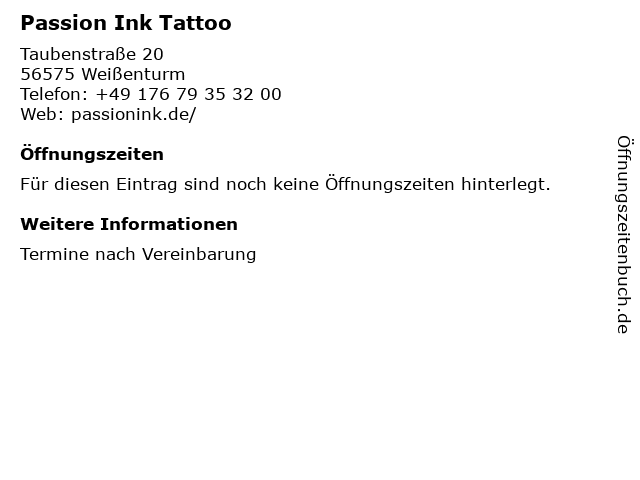 | Öffnungszeiten Passion Ink Tattoo in Weißenturm anzeigen | |