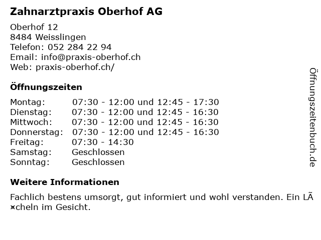 1 Zahnarztpraxis Oberhof - Dr. med. dent. Christian Wiedmer (Entfernung: 0,00 km) Oberhof 12, 8484 Weisslingen 6 |