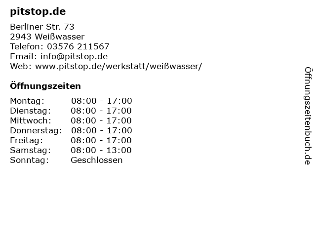 | Öffnungszeiten pitstop.de in Weißwasser anzeigen | |