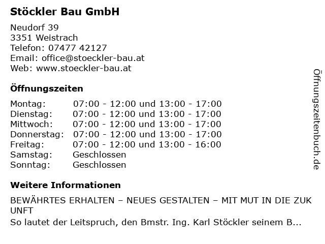 | Öffnungszeiten Stöckler Bau GmbH in Weistrach anzeigen | |