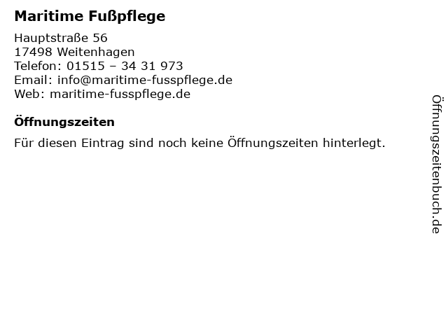 | Öffnungszeiten Maritime Fußpflege in Weitenhagen anzeigen | |