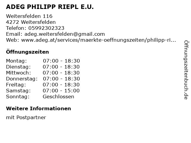 | Öffnungszeiten ADEG PHILIPP RIEPL E.U. in Weitersfelden anzeigen | |