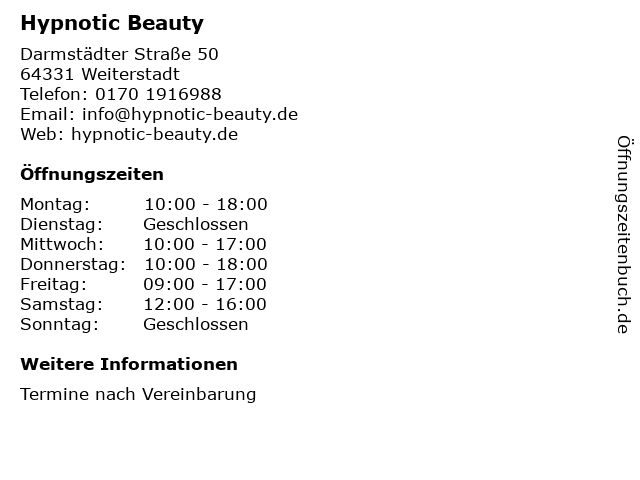 | Öffnungszeiten Hypnotic Beauty in Weiterstadt anzeigen | |