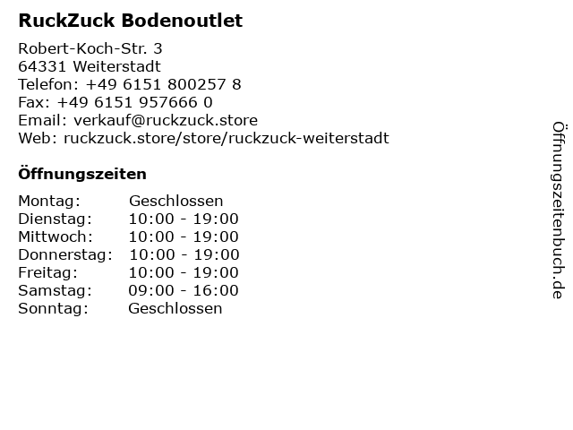 | Öffnungszeiten RuckZuck Bodenoutlet in Weiterstadt anzeigen | |