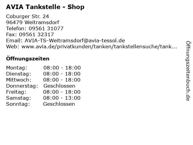 | Öffnungszeiten AVIA Tankstelle - Shop in Weitramsdorf anzeigen | |